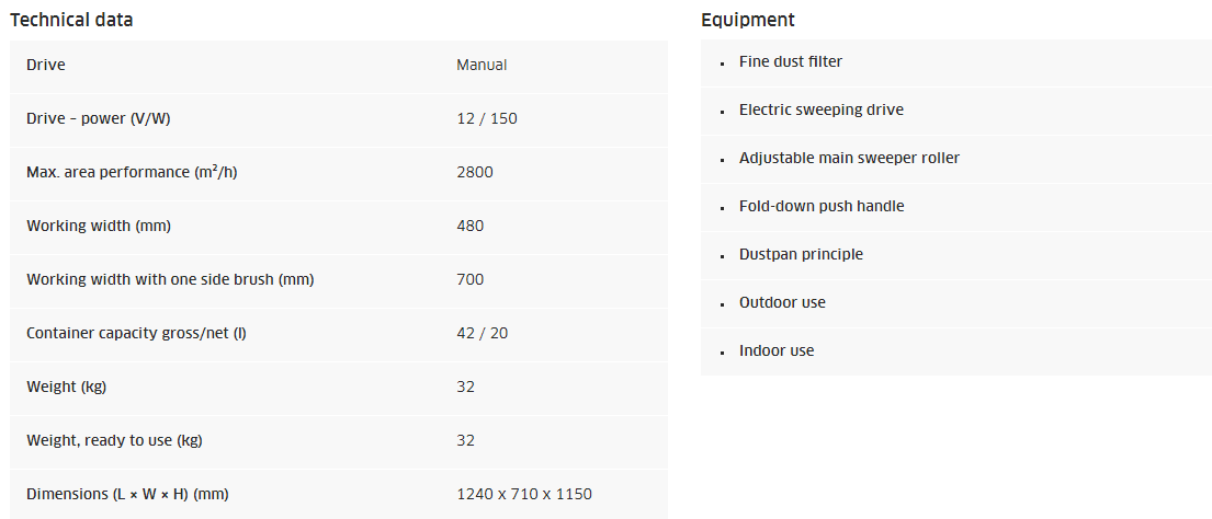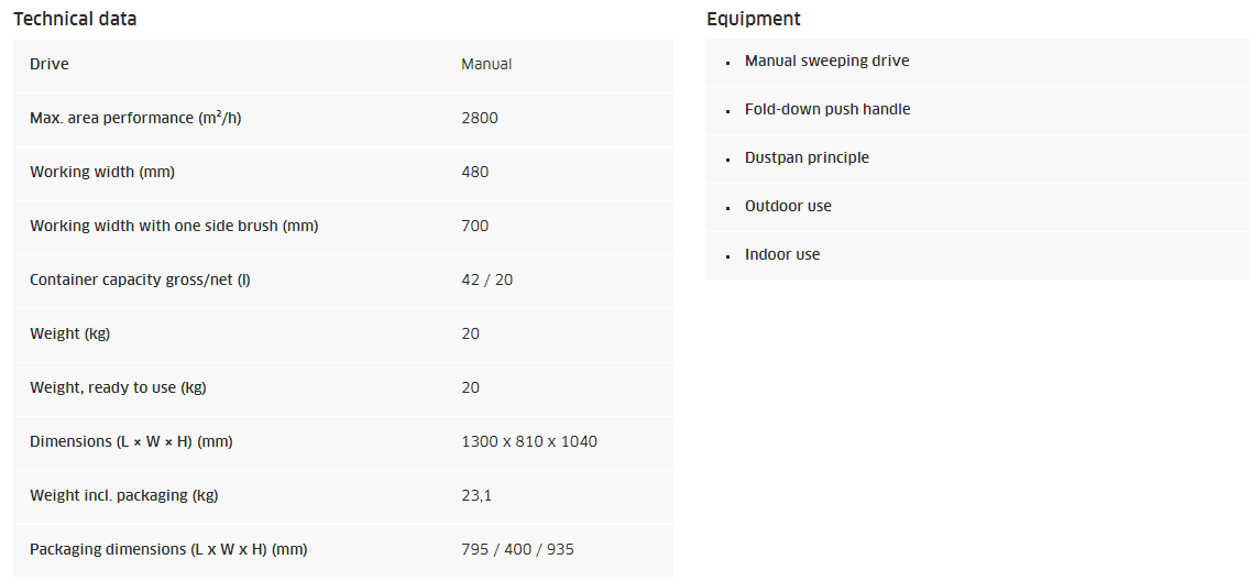 Penyapu dorong yang dibentuk cantik untuk membersihkan area kecil indoor dan outdoor. Kinerja area hingga 2800 m² / jam. Hanya sedikit sentuhan dorong alat ini bisa bermanuver kemanapun yang kita mau. Debu atau kotoran yang kita sapu akan terkontrol dengan rapi dan tidak menyebar kemana-mana. Sikat rol utama digerakkan melalui kedua roda yang mengarah ke hasil sapuan luar. Sikat samping yang dapat diatur secara bertahap memungkinkan penyesuaian yang optimal ke lantai dan objek penyapuan. Penyimpanan hemat ruang dan mudah dibawa karena beratnya yang enteng.
